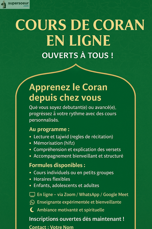 Je propose des cours en ligne pour l’apprentissage de la lecture de coran, de sa mémorisation tout en joignant les règles de tajwid. Possibilité d’ajouter des cours de dars.