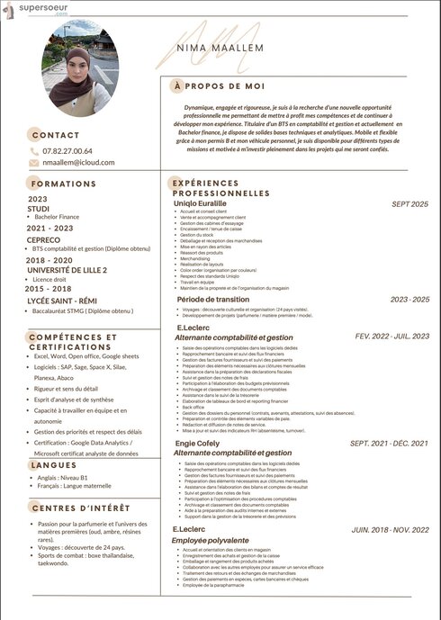 Actuellement à la recherche d’une opportunité professionnelle afin de mettre en pratique et développer mes compétences, je suis titulaire d’un BTS Comptabilité et Gestion, effectué en alternance. Cette expérience m’a permis de réaliser des missions en comptabilité, ressources humaines et contrôle de gestion.