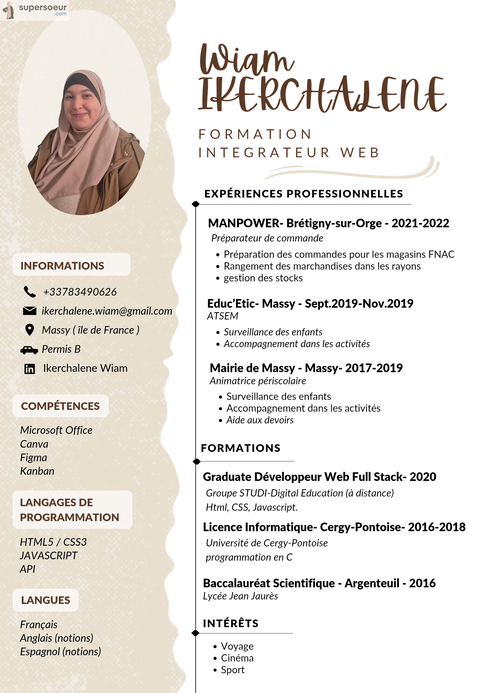 J’ai suivi une formation en intégration web, qui m’a permis d’acquérir des bases solides dans le numérique et le travail sur ordinateur.