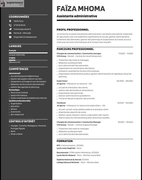Dotée d’un bon sens de l’organisation, à l’aise avec l’outil informatique, sérieuse et impliquée, je suis prête à m’investir durablement.