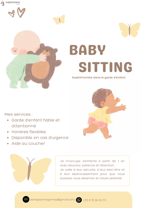 je propose une garde d’enfant en étant disponible dans l’immédiat et tout les jours sauf le dimanche. (Je propose la garde chez le domicile de l’enfant !)
