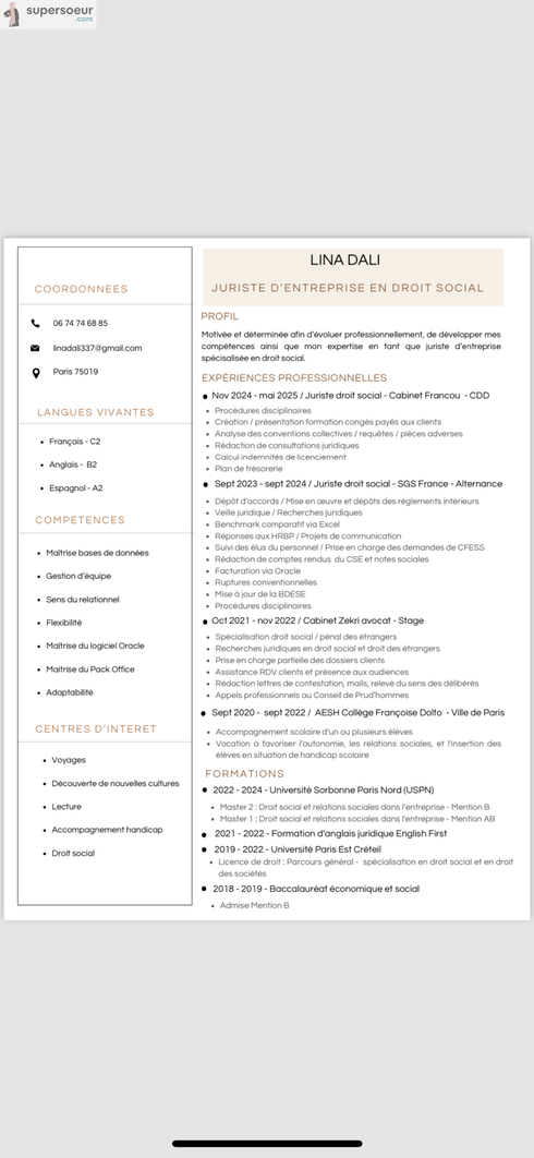 Titulaire d’un master 2 en droit social et relations sociales en entreprise, je suis actuellement à la recherche d’un poste en tant que juriste en droit social.