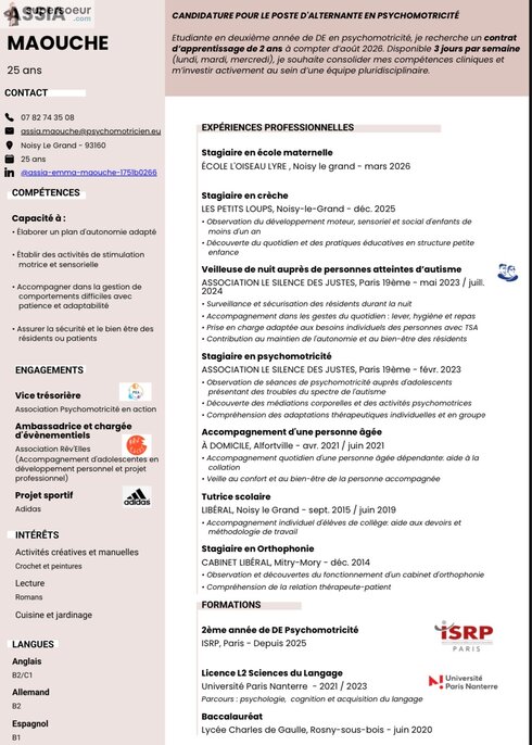 Je suis Assia, en formation au métier de psychomotricienne je suis à la recherche d’une alternance en raison de 3 jours par semaine ( lundi, mardi, mercredi)