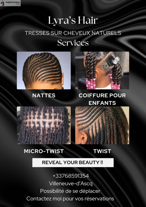 Je propose des services de tresses sur cheveux naturels à domicile pour adultes et enfants. Possibilité de se déplacer.