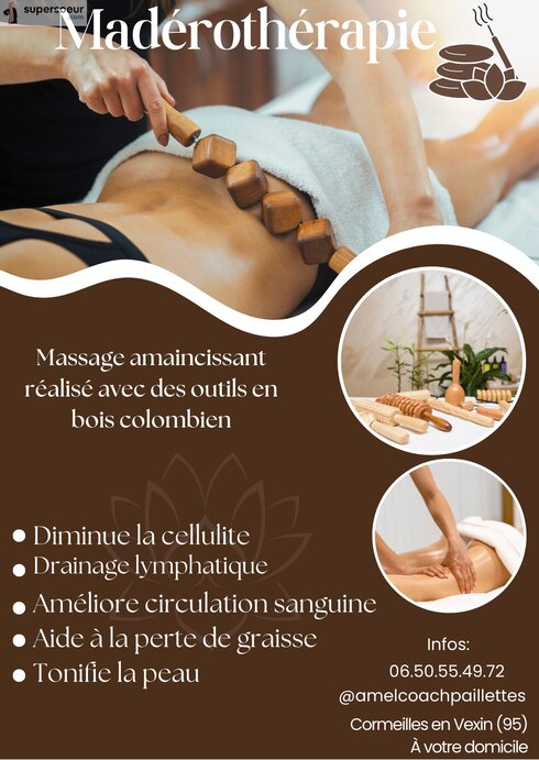 La maderotherapie est un massage drainant et amincissant réalisé avec des outils en bois colombien. Celui-ci à des bien faits sur la peau, active la circulation sanguine , diminue la cellulite, favorise la perte de gras, lutte contre la rétention d'eau.