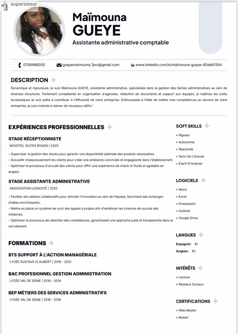 Je suis actuellement à la recherche d'un poste d'Assistante Administrative. Après plusieurs années d’études avec au total 33 semaines de stages effectués dans le domaine administratif, je possède une solide maîtrise des outils bureautiques, de la gestion des plannings et des tâches administratives variées.