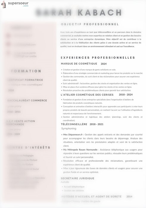 Avec trois ans d'expérience en tant que téléconseillère et un parcours dans le domaine commercial, je souhaite mettre mon expertise en relation client et en gestion des besoins clients au service d’une entreprise dynamique. Mon objectif est de contribuer à la satisfaction et à la fidélisation des clients grâce à une écoute active et un service de qualité, tout en évoluant dans un environnement stimulant et axé sur l’excellence.