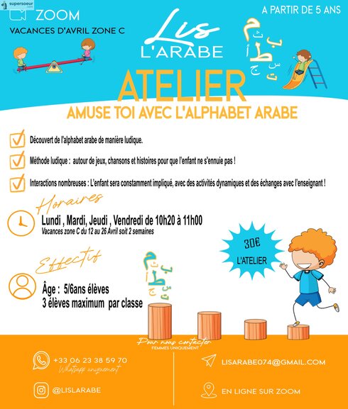 Je propose également des ateliers dédiés aux enfants pour apprendre l’alphabet arabe en s’amusant.