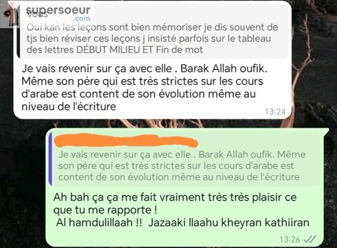 Ensuite nous pourrons commencer la lecture et écriture des mots simple puis nous poursuivrons bi idhni llaah 3azza wa jall sur la lecture de textes et quelques invocations jusqu'à la fluidification de ta lecture.