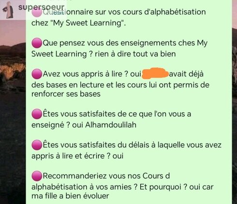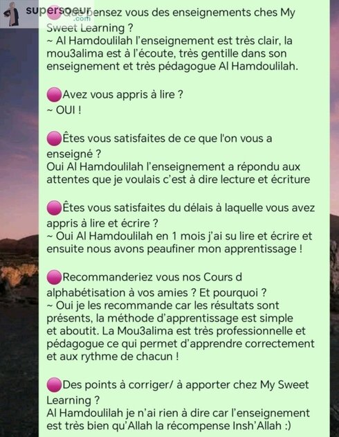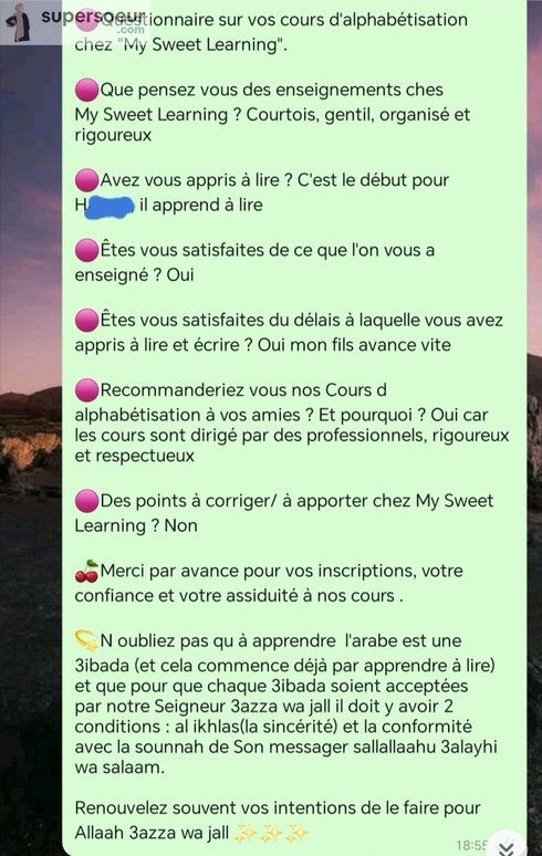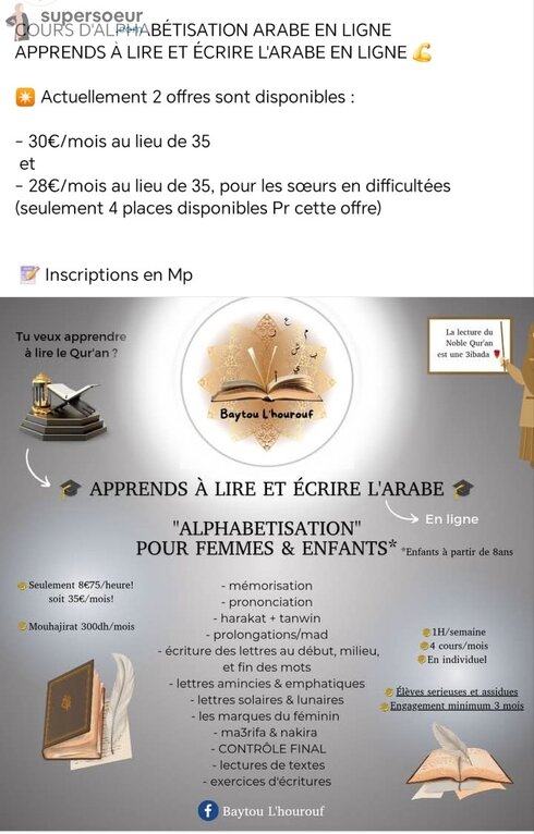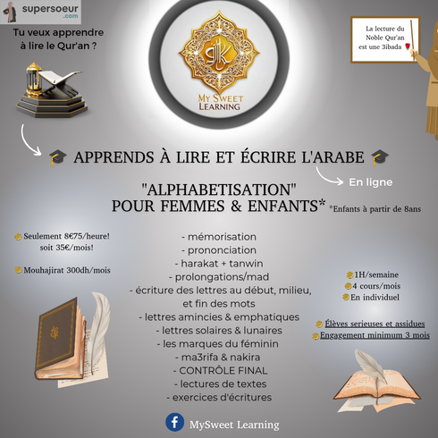 Que tu sois débutante ou niveau avancé dans l'alphabétisation arabe, nous reprendrons depuis le début afin d'être sur que tu aïs les bonnes bases in shaa a llaah.