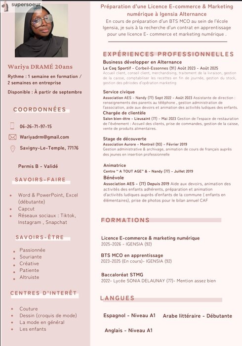 Mon parcours en BTS MCO se terminant bientôt, m’a permis d’acquérir des compétences telles que en relation client, assumer l’autonomie du point de vente et en stratégie commerciale. Grâce à ces acquis, j’ambitionne de créer à l’avenir ma propre boutique en ligne dédiée à la mode féminine, alliant vêtements pudiques et tenues traditionnelles ouest-africaines. Une expérience au sein de d’une entreprise serait une opportunité précieuse pour me familiariser avec les stratégies digitales, de la vielle , l’acquisition de clients en ligne et l’optimisation des ventes sur Internet.