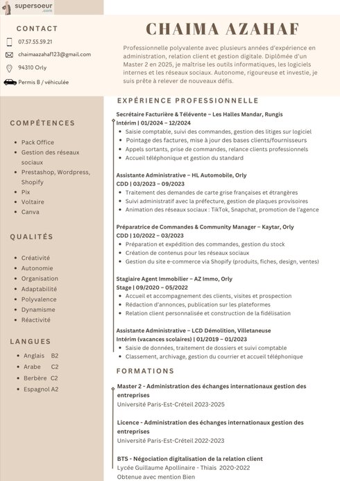Professionnelle polyvalente diplômée d’un Master 2, avec une solide expérience en administration, relation client et e-commerce (Shopify, Prestashop, WordPress). Sérieuse, autonome et dynamique, je suis prête à m’investir dès maintenant dans un poste administratif ou digital.
