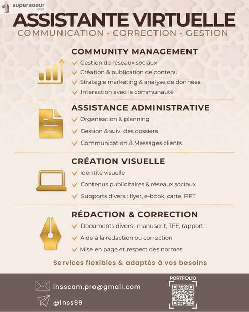 Grâce à mes compétences solides en marketing , secrétariat et rédaction, je propose un large éventail de services adaptés à vos besoins, avec sérieux, rapidité et minutie.