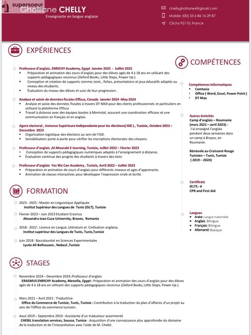 Je suis enseignante d’anglais passionnée, capable d’enseigner à des apprenants de tous âges et de tous niveaux. J’adapte mes cours aux besoins spécifiques de chaque personne afin de leur permettre de progresser efficacement et en confiance. Mon objectif est de rendre l’apprentissage de l’anglais accessible, interactif et motivant pour tous.