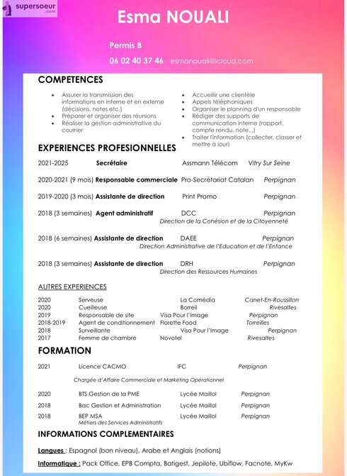 Secrétaire expérimentée (5 ans d’expérience), je maîtrise la gestion de standard, l’accueil, le Pack Office, les devis et factures (y compris relances), le classement et la gestion des dossiers, papiers et informatiques, les plannings et la mise à jour des bases de données.