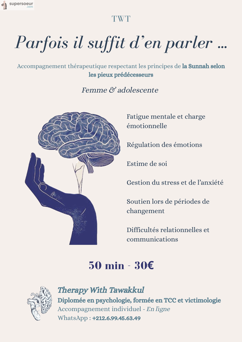 Diplômée en psychologie, formée en thérapies cognitivo-comportementales (TCC) et en victimologie, je lance, par la grâce d’Allâh, mon activité d’accompagnement thérapeutique respectant les principes de la sunnah selon la compréhension des pieux prédécesseurs.