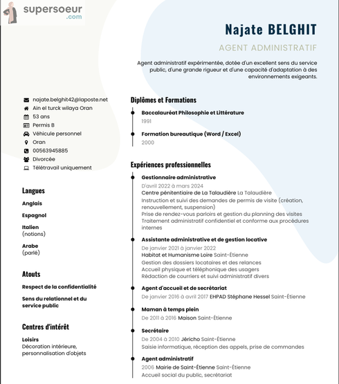 Experte en gestion administrative et habituée à la relation usager avec bienveillance et courtoisie, je sais écouter, conseiller ,et accompagner efficacement. Autonome, organisée et rigoureuse, je suis disponible immédiatement pour m'investir dans un poste de chargée de clientèle en télétravail.